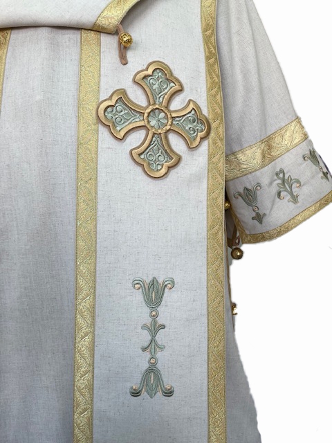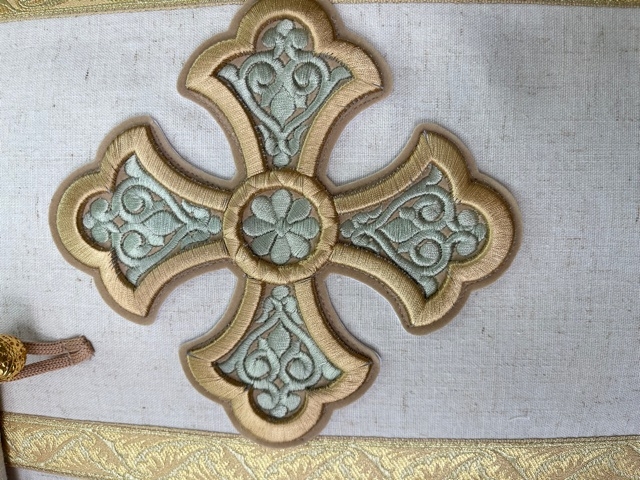 | Парча "Янина" (зелёная/золото) | Парча "Рязань" (чёрная/золото) | Облачение на жертвенник из парчи ПГ6 (фиолетовый/золото) |